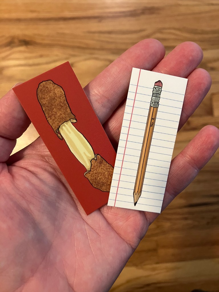 Last month I took my newest merch gems out into the world and they were a hit! My mini bookmarks are delightful because they are tiny little pieces of art for your book. Tiny things are my favorite so putting together tiny bookmarks with tiny drawings of things like a mozzarella stick or a mini number two pencil, you can’t ask for anything cuter than that.