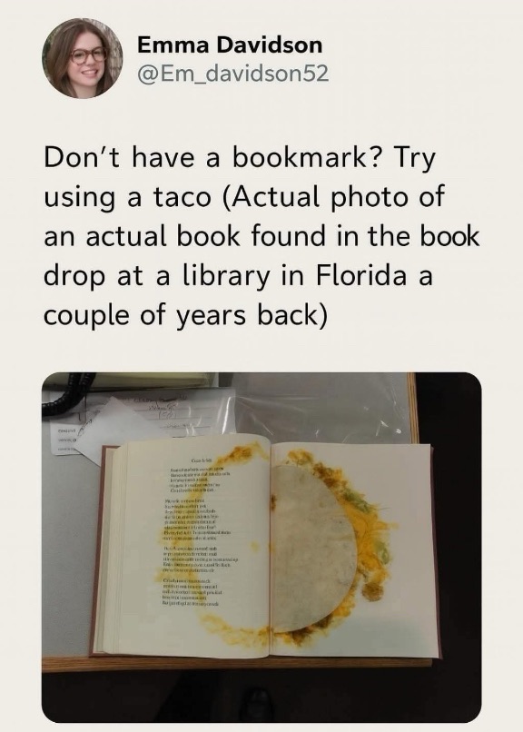 I’m pretty sure this is a poetry book, which makes this bookmark ridiculously poetic. Don’t you agree? It’s also a library book, so I am wondering if they threw this taco in in a rush and forgot before it went to the drop box?? But truly, who the hell uses a taco as a bookmark?!? Animal! I thought I was bad folding the corners.