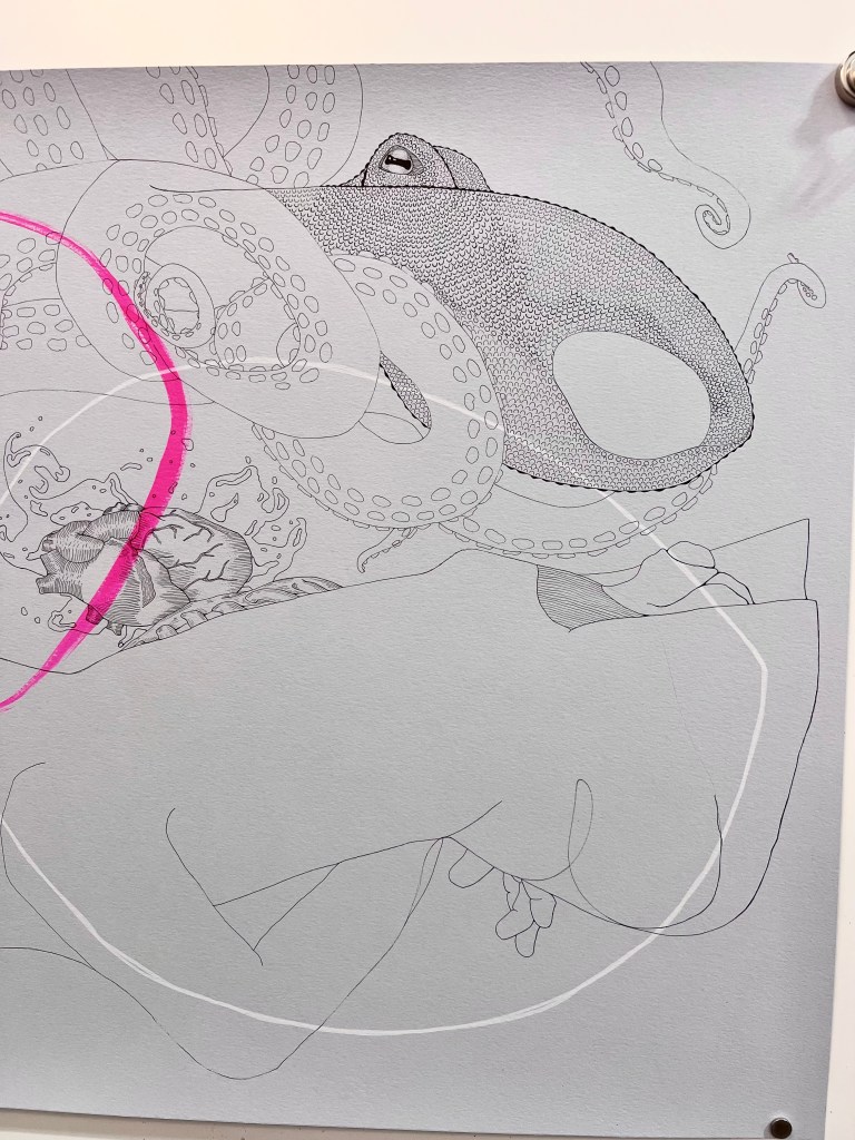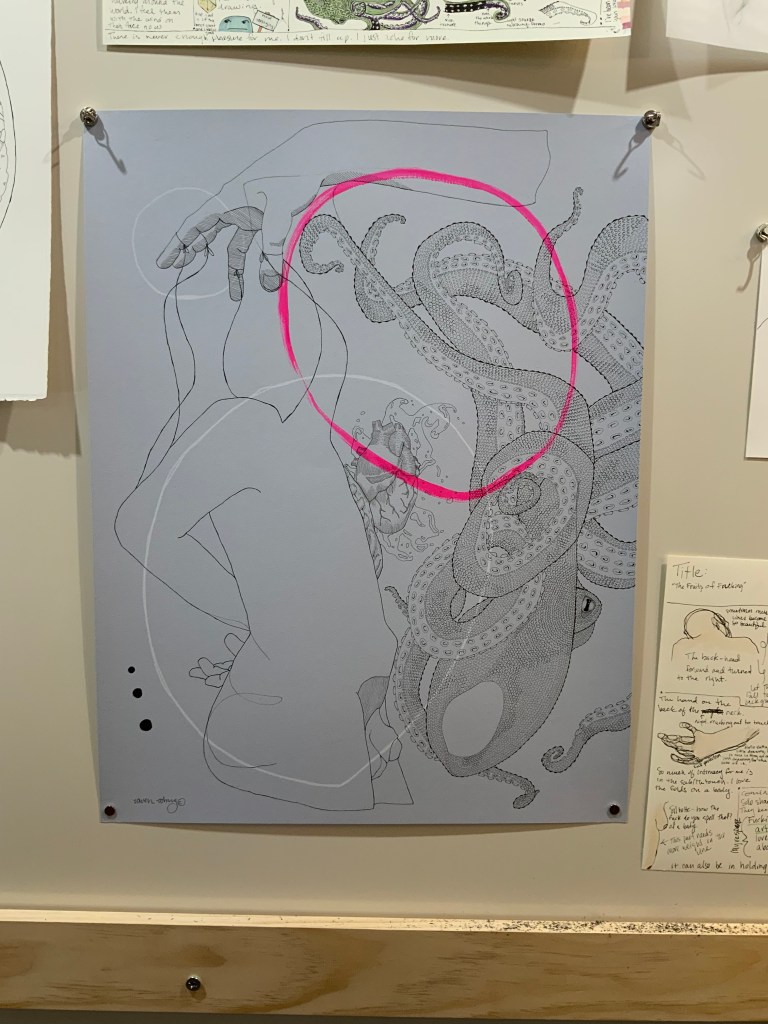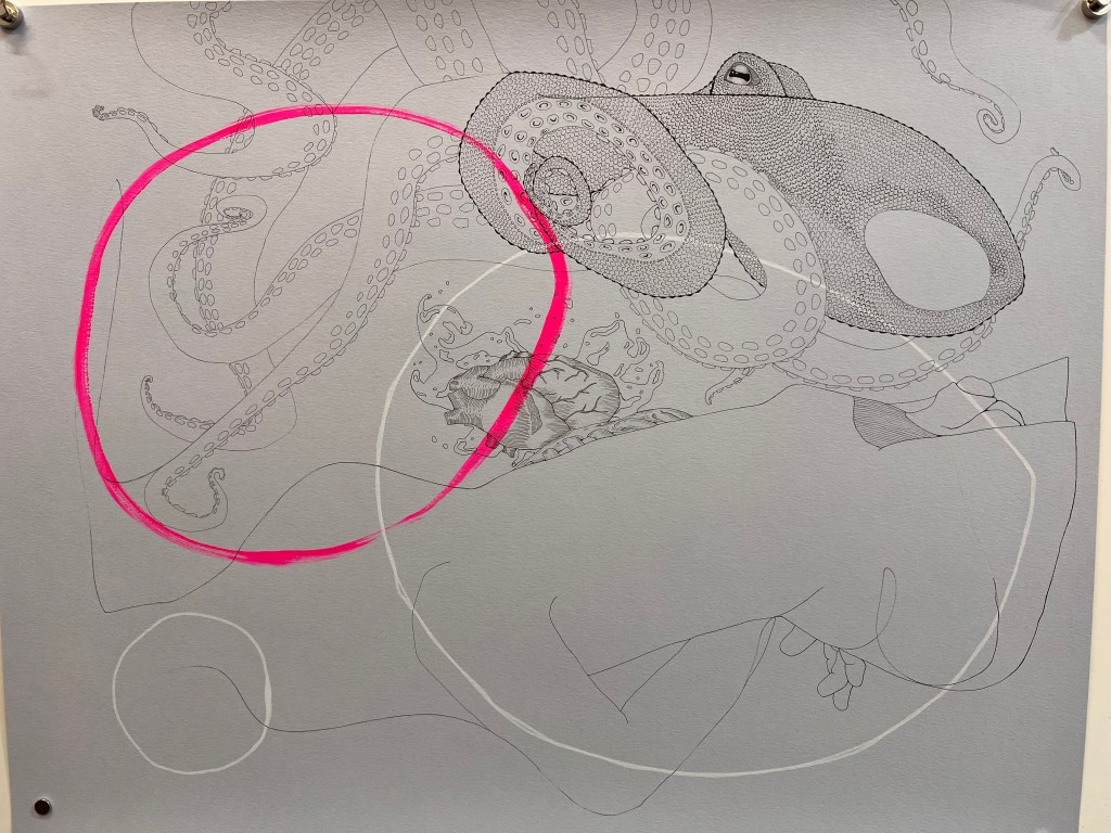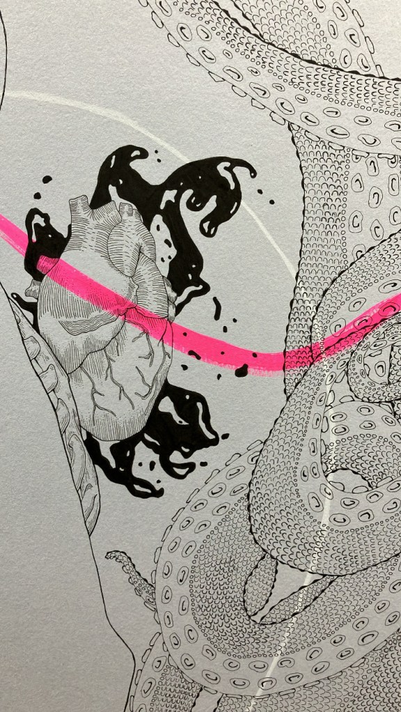 The octopus was amazing to draw because I got to lose myself in meditative patterning. Up until this point, this is the heaviest detail I’ve brought to life in my drawings and the result says it all: keep doing that.