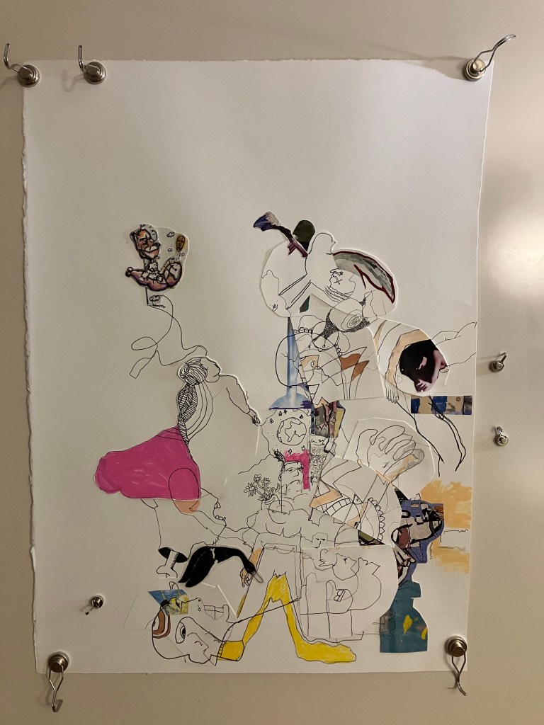 While we were drawing and collaging I had SO many ideas float into my mind that I would like to explore in my personal work. Like, what if I started one of my drawings as I always do, scribbles and then draw some details out, but then I start cutting it up and putting it back together in different ways. What if I did this on vellum?! (Although I was at the art supply store the other day and the pack of vellum I usually buy WAS EIGHTY DOLLARS. Yikes.) Anyway, I had so many ideas pop into my head while we were talking and making this piece side by side. There are so many edges you push when making art out of your comfort zone and having to work together.
