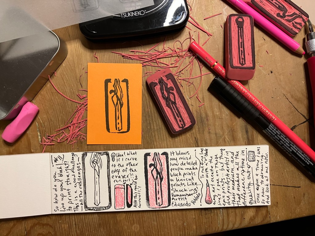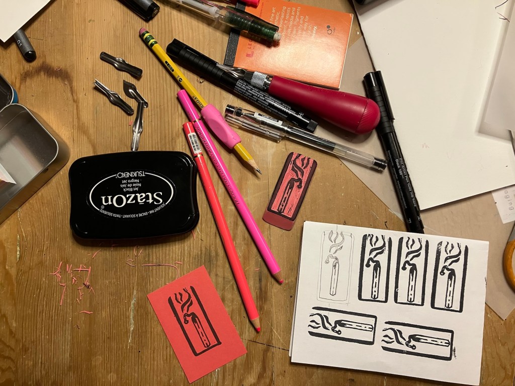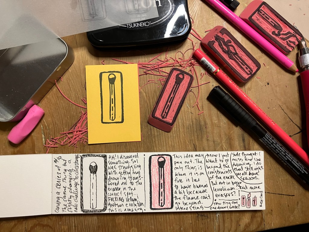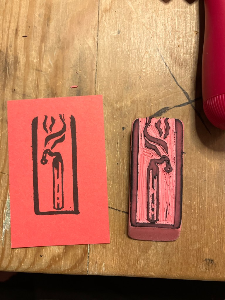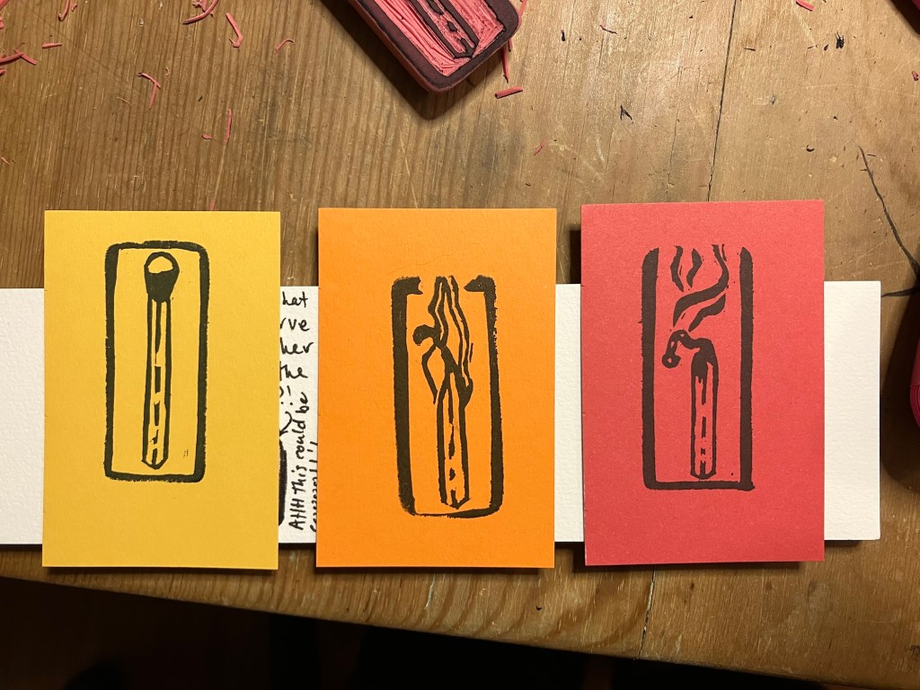 Anywho, I revisit the burning match often – most recently in my new block print studies, I carved three new erasers this week!