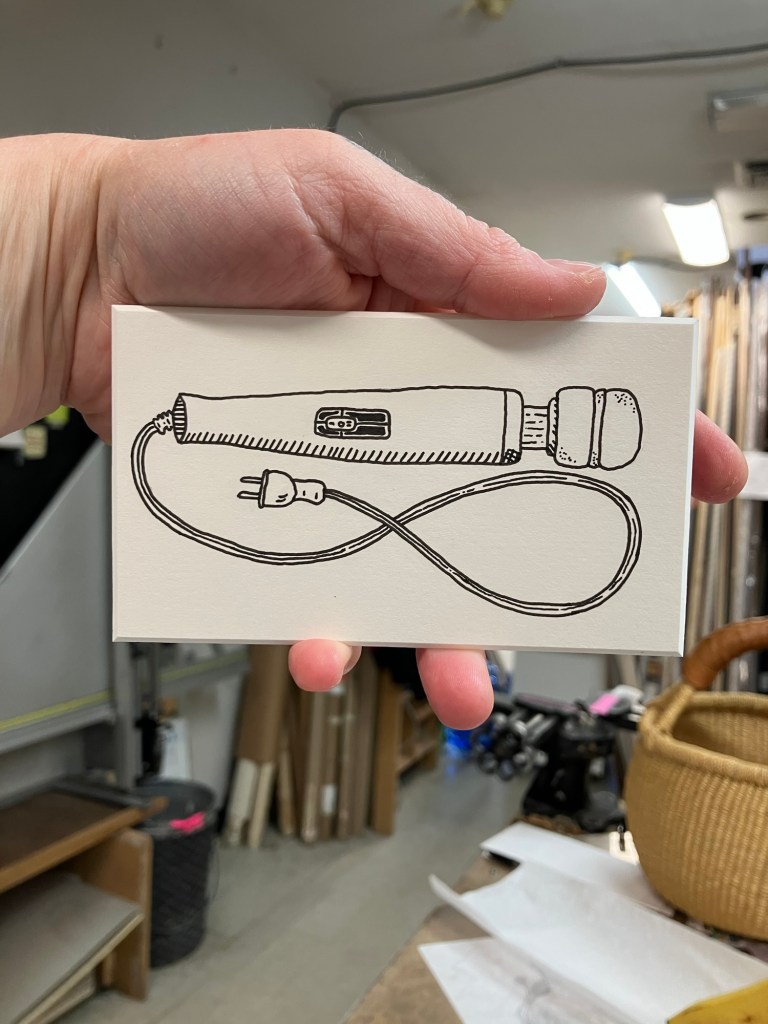 My newest drawing was inspired by the postcard and bumper sticker design I just made. It’s fun taking an idea and rendering it in all the mediums I work in. Next is a tiny pink eraser block print!